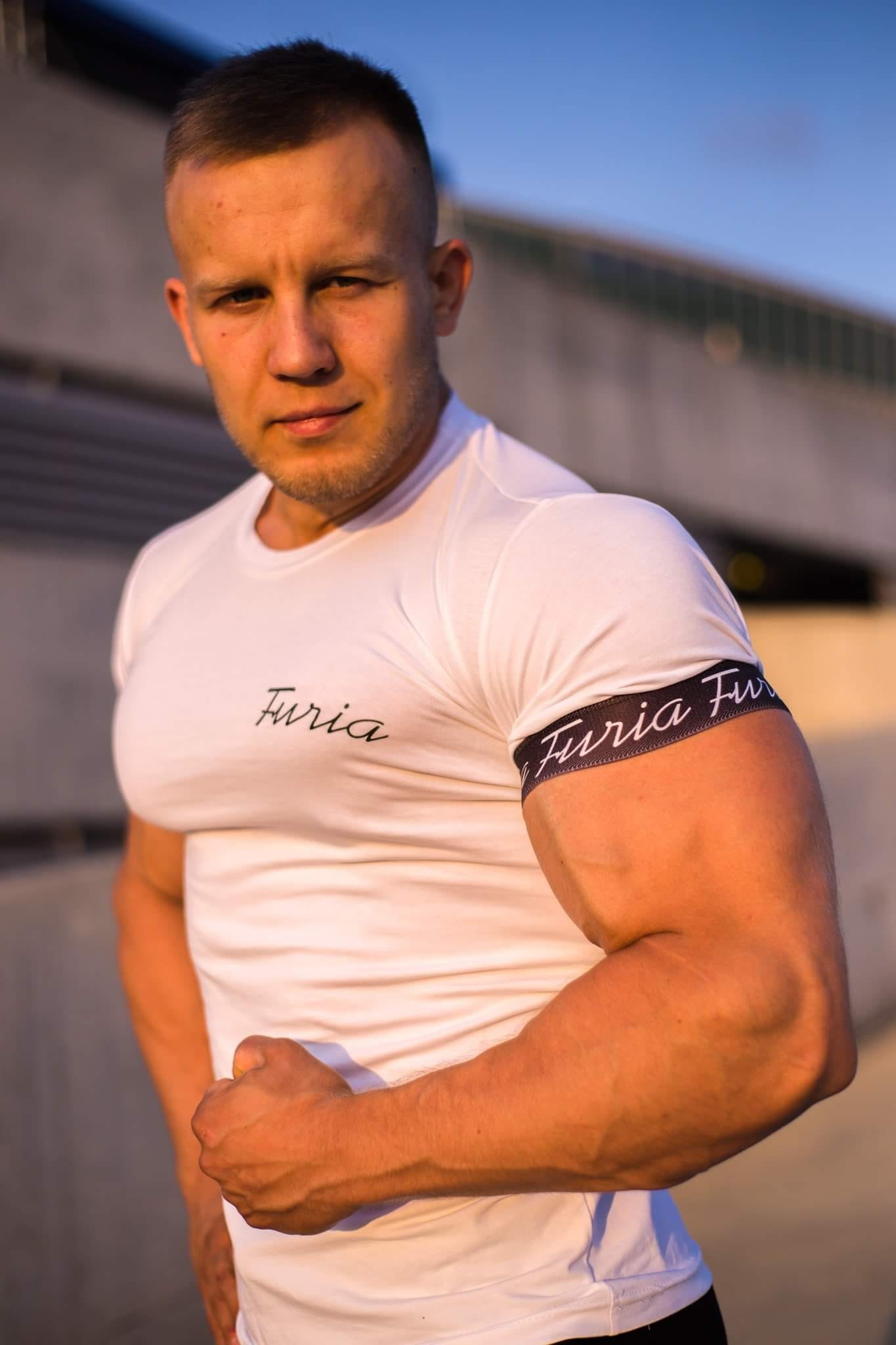 Koszulka męska FURIA z nadrukiem odpornym na ścieranie i zniekształcenia. Specjalnie wzmocnienie na ramionach i specjalnym ściągaczem z dodatkiem elastanu. Nadruk został wykonany za pomocą sitodruku. Koszulka posiada metkę firmową naszego sklepu.