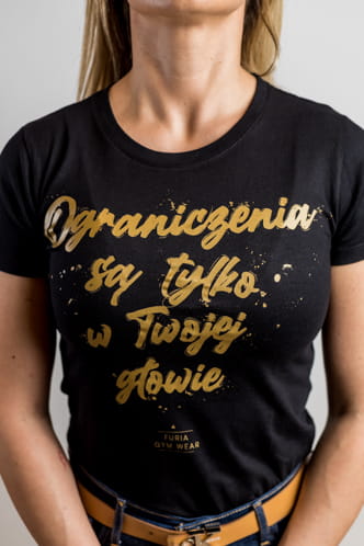 Koszulka damska "Ograniczenia są tylko w Twojej głowie" FURIA optymalne przylega do ciała co sprawia, że odzież sportowa FURIA leży doskonale i podkreśla sylwetkę. Komfort i jakość odzieży dla sportowców FURIA to nasze priorytety.